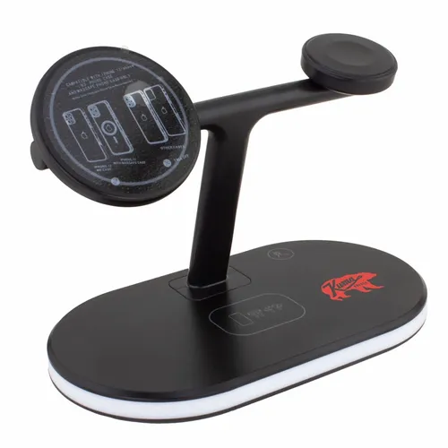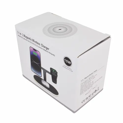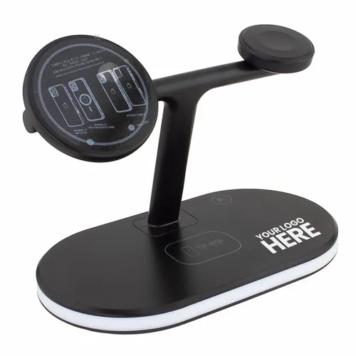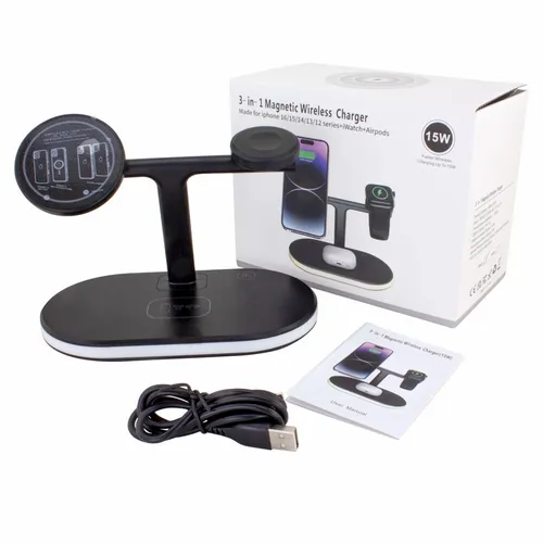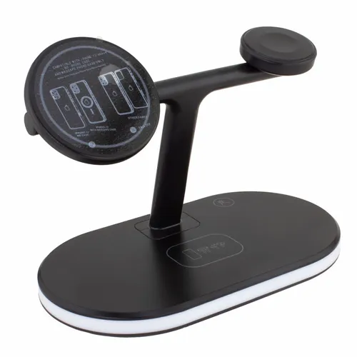 The 3-in-1 Magnetic Wireless Charger is a fast wireless charger for smartphones, ear buds, and smart Watches. The left side recharges compatible smartphones. On the right side of the stand, it will recharge compatible smart Watches. On the base, you can wirelessly recharge compatible earbud cases or if you have a secondary phone, it is another convenient location to recharge another smartphone. On the stand, compatible devices are suspended in clear view.